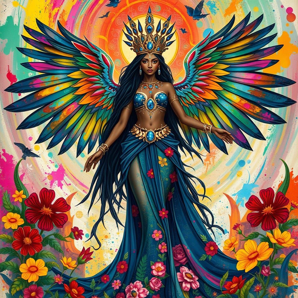 This image depicts a regal, bronze-skinned queen amidst a colorful, swirling vortex, surrounded by lush plants and vibrant flowers, with intricate, glowing tattoos and a flowing, ornate gown, evoking the ethereal beauty of art nouveau
