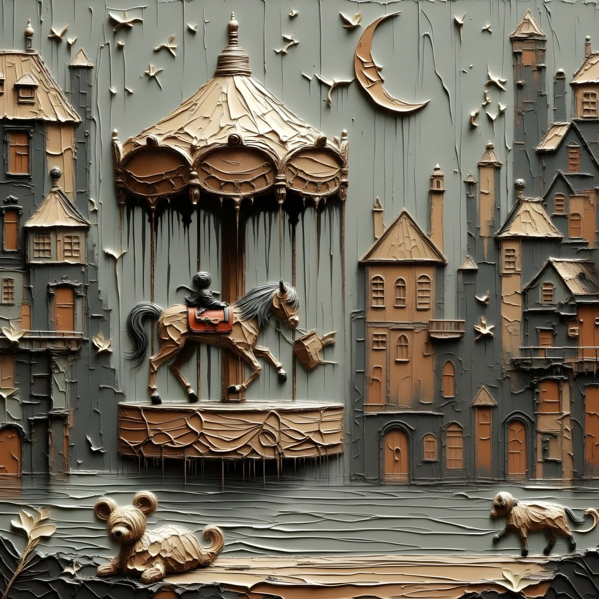 This image showcases a whimsical, antique porcelain carousel with hand-painted details. It features a horse, carriage, and boat, set against distressed buildings in a photorealistic style.