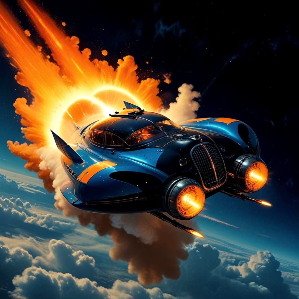 This spaceship resembles a modified dieselpunk Art Deco blue and black 1949 Delahaye Type 175 S space travel Roadster, where the wheels woul...