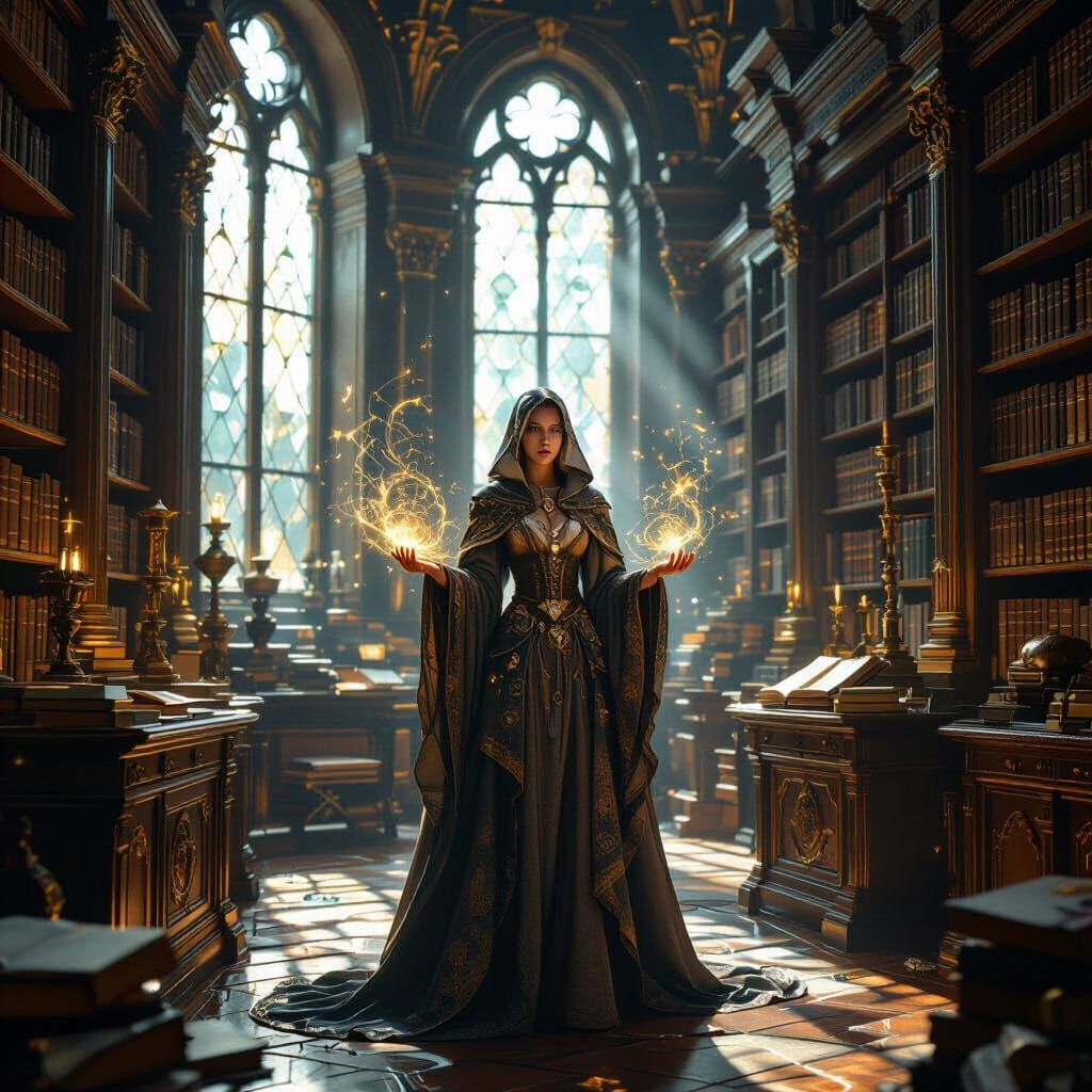 This image depicts Anna Mons as a sorceress in a grand baroque library, filled with arcane objects and magical texts. Sunlight streams through arched windows, creating a volumetric lighting effect.