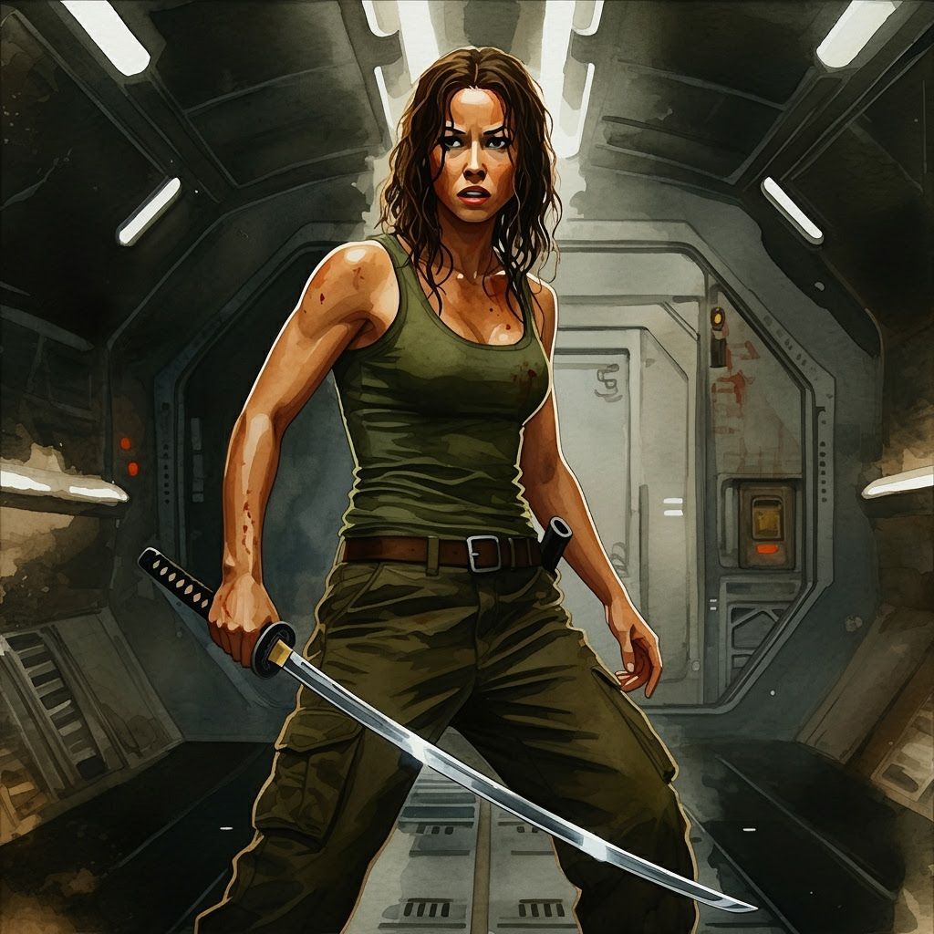 A dramatic watercolor painting of a young woman with a sword in a spaceship. The artwork uses dark, impressionistic techniques to create an ominous, sci-fi scene.