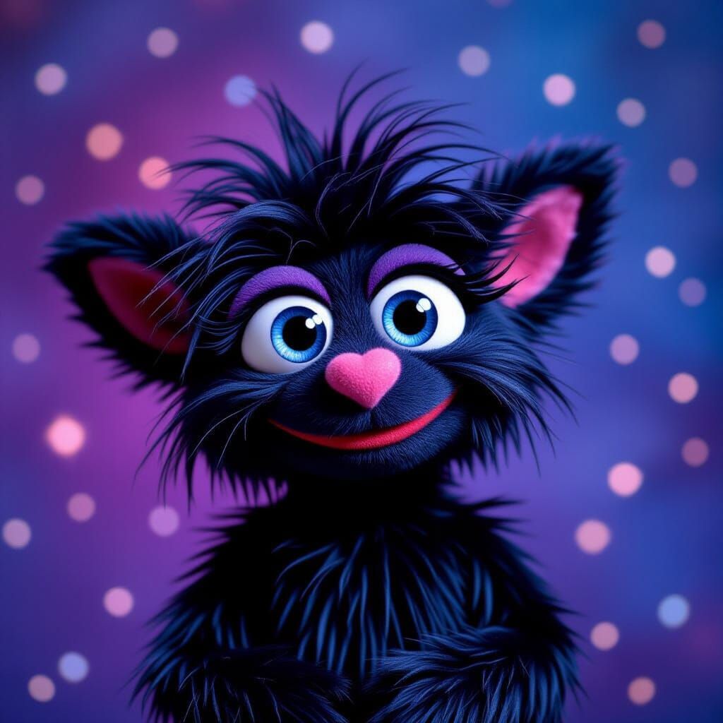 A cute, fluffy black imp with big eyes and a heart-shaped nose, winking playfully. Rendered in a vibrant, whimsical style with a magical, starry night background.