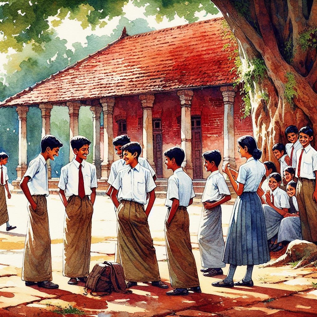 This watercolor illustration captures a sunny afternoon at a Sri Lankan school, showing students laughing and sharing moments. It blends traditional uniforms with a nostalgic, impressionistic style.