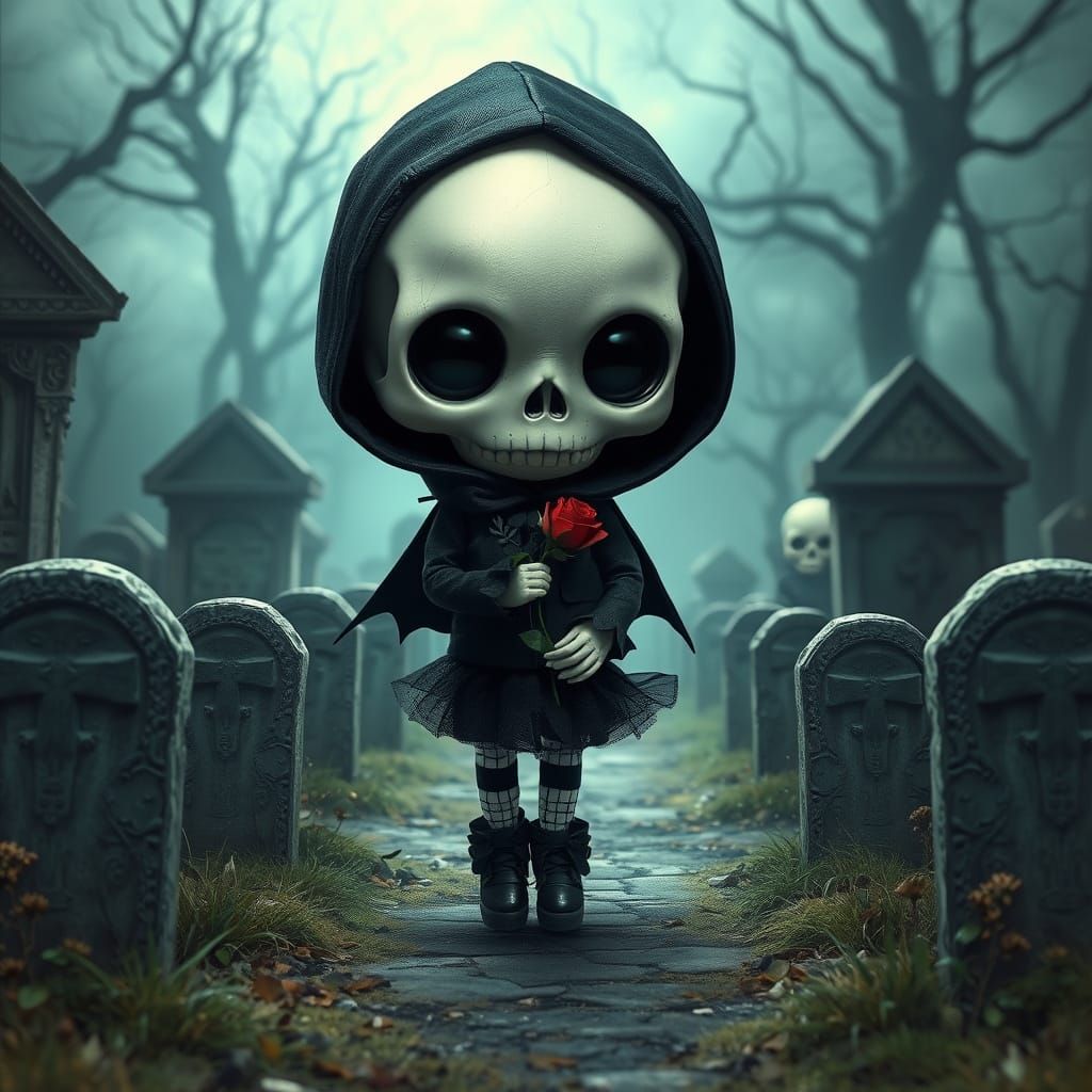 Cute chibi doll, big skull head, adorable empty eye-holes, black hood, black outfit, black gothic shoes, wandering among tombs holding black rose, graveyard, Epic cinematic brilliant stunning intricate meticulously detailed dramatic atmospheric maximalist digital matte painting