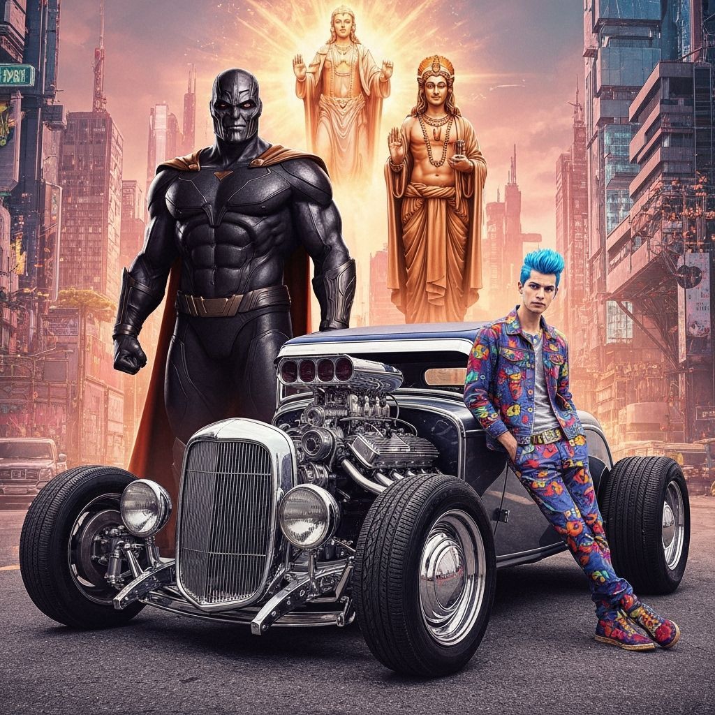 This image shows General Zod alongside a deity, a hot rod, and a Mod, set against a futuristic cityscape. The composition highlights the contrast between each character and the vibrant backdrop, captured with a dynamic perspective.