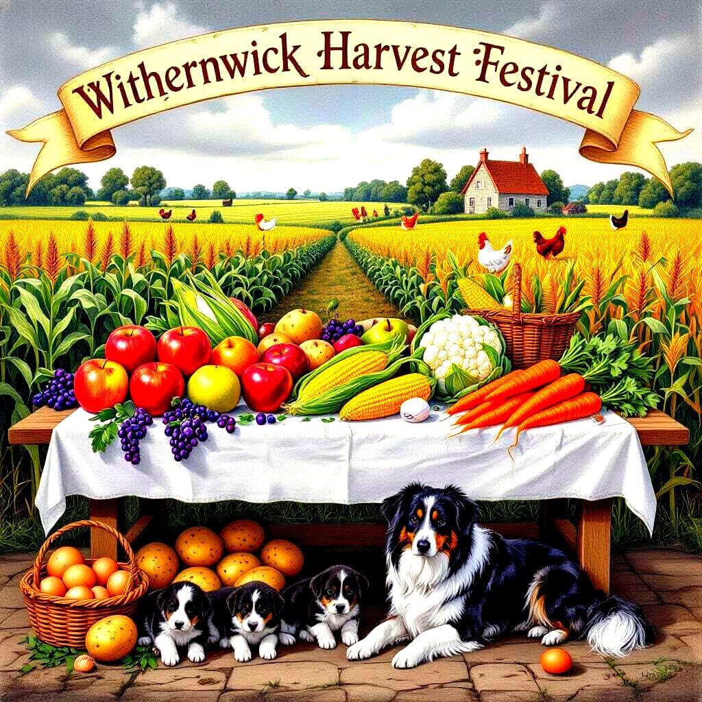 This detailed charcoal drawing depicts the Withernwick Harvest Festival, featuring a bountiful table of produce, a sheepdog with puppies, and farm animals in a pastoral setting.