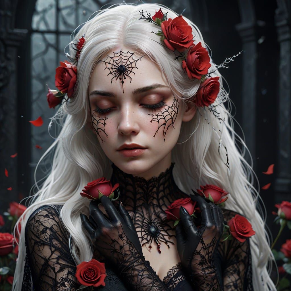 A striking picture of a pale woman with white hair and a black lace veil. Her face features intricate red cracks, and she holds two red roses in gloved hands, all rendered as gothic dark fantasy digital art.