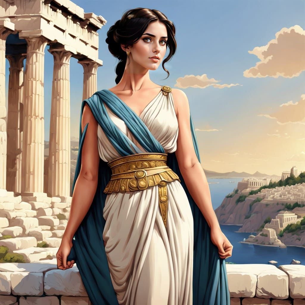 This image depicts a dark-haired woman in a Greek chiton dress, set against the backdrop of ancient Athens. The artwork is rendered in a realistic cartoon style.