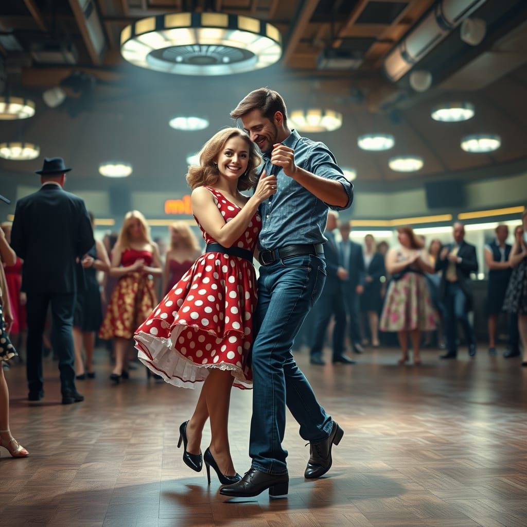 This image depicts a vibrant rock and roll dance scene with a stylish 1950s couple. The hyperrealistic image captures the energy of the dance floor, complete with disco balls and onlookers.