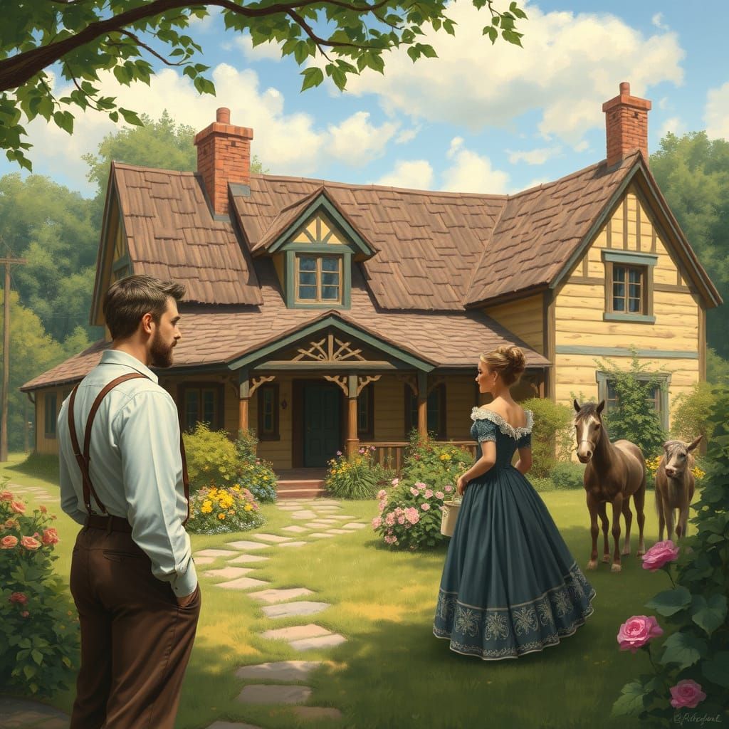 A man in traditional clothes visits his uncle's country house to meet a woman in elegant attire. The scene evokes a warm, sentimental atmosphere with a realistic, folksy style.
