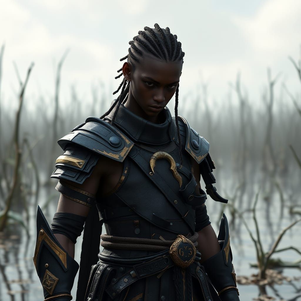 This image shows a tall, slender, African American teen with cornrows practicing in a swamp. He wears battle-worn black and gold armor with wrist and foot wraps, rendered as 3D anime art.