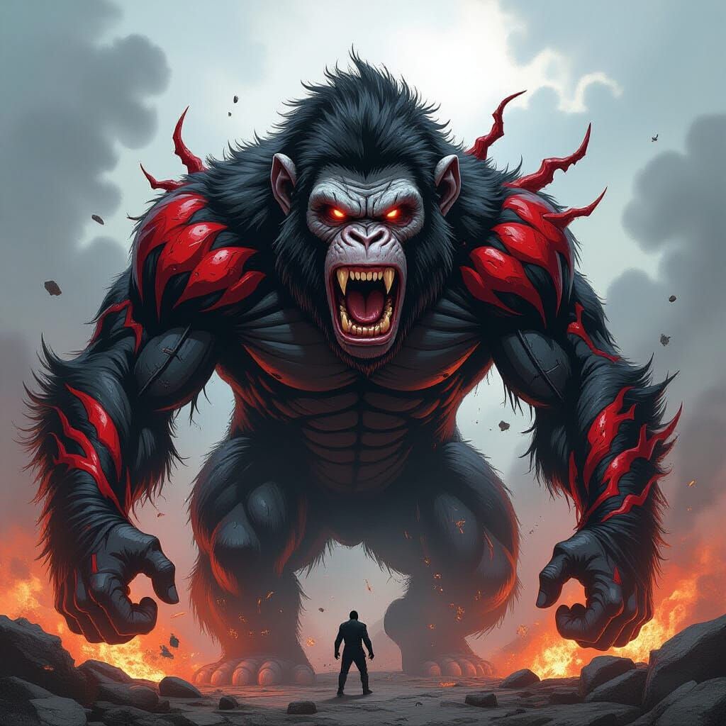 This image shows a colossal chimpanzee monster, covered in a red and black alien symbiote, destroying a city. The artwork features dark, detailed inkwork and vibrant colors with grotesque textures.