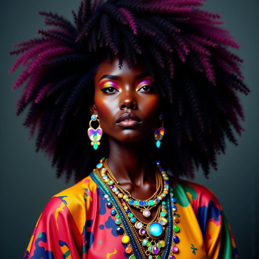 This image shows a beautiful ebony woman with vibrant hair, wearing colorful African-inspired clothing and futuristic jewelry. The artwork features hyperrealistic details and subtle, luminous lighting in a digital art style.