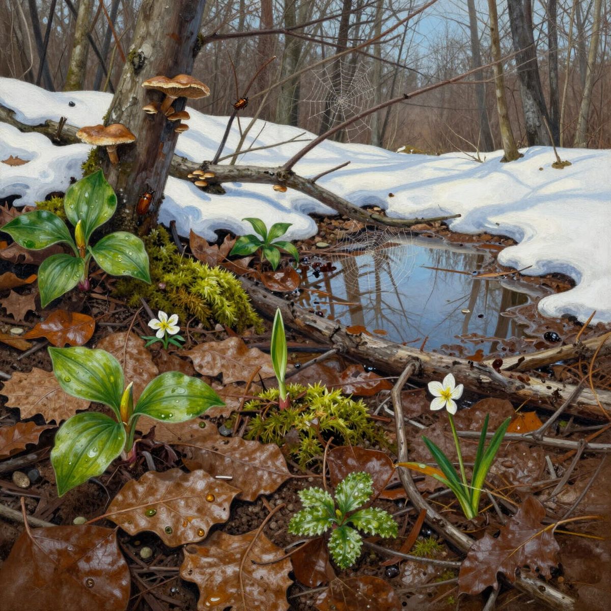 This detailed gouache painting captures the forest floor in early spring, showcasing the simultaneous decay of old leaves and the vibrant new growth of shoots, ferns, and wildflowers.