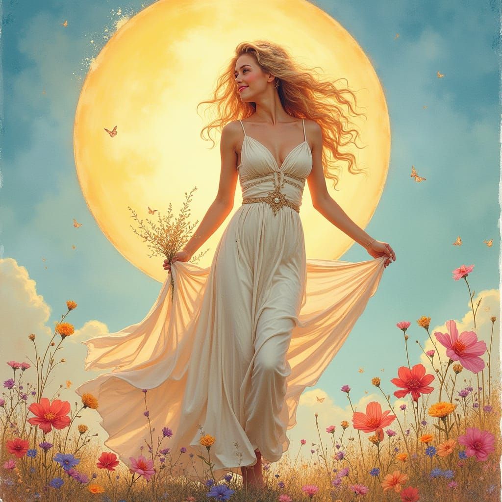This image shows a smiling Victorian Aphrodite walking along a flower-lined path, depicted in a vibrant and expressive watercolor style with a pastel rainbow color palette, intricate details, and dramatic lateral lighting.