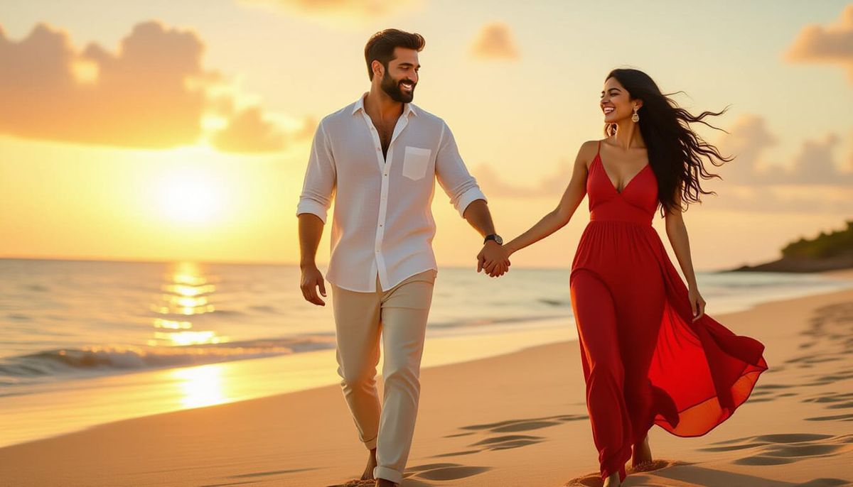 This ultra-realistic image captures a romantic couple at a luxury beach resort during a golden sunset. Warm light reflects on the sand and water, creating a joyous atmosphere.
