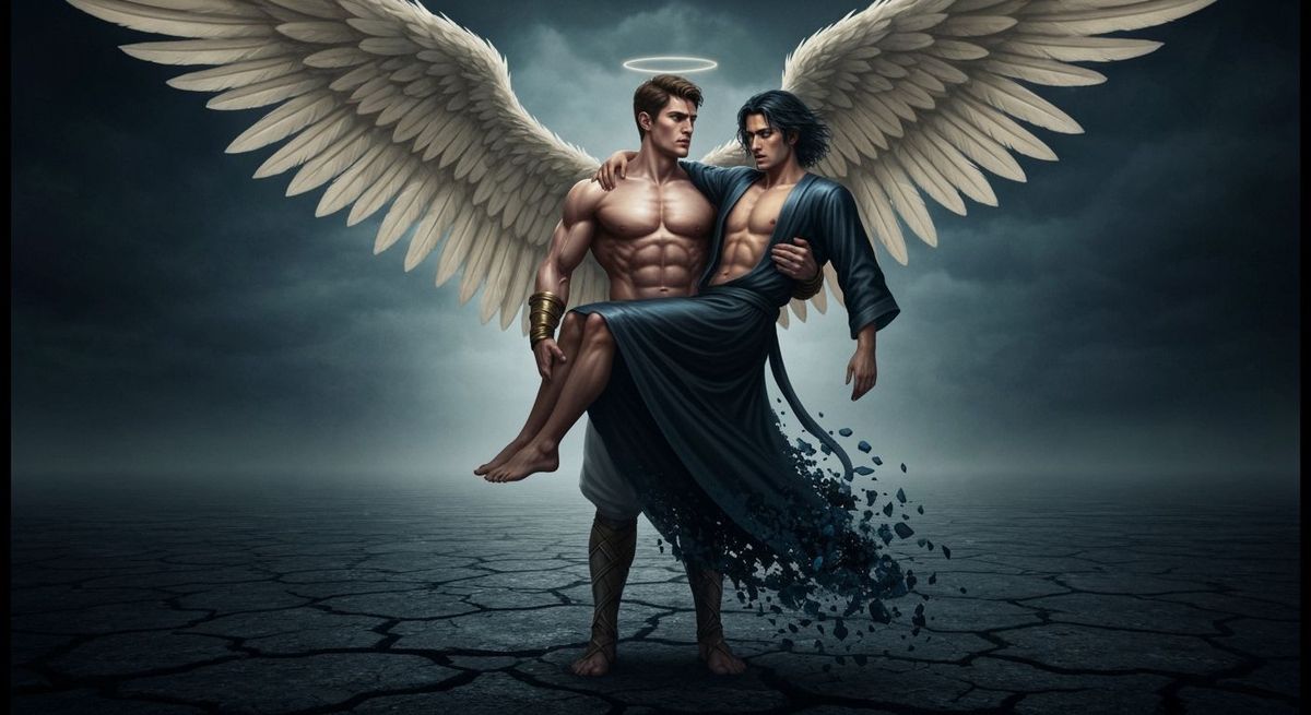 This photorealistic digital painting captures a powerful angel with vast wings holding his husband, whose robe fragments into ash. Dramatic lighting and a desolate landscape enhance the epic fantasy scene.