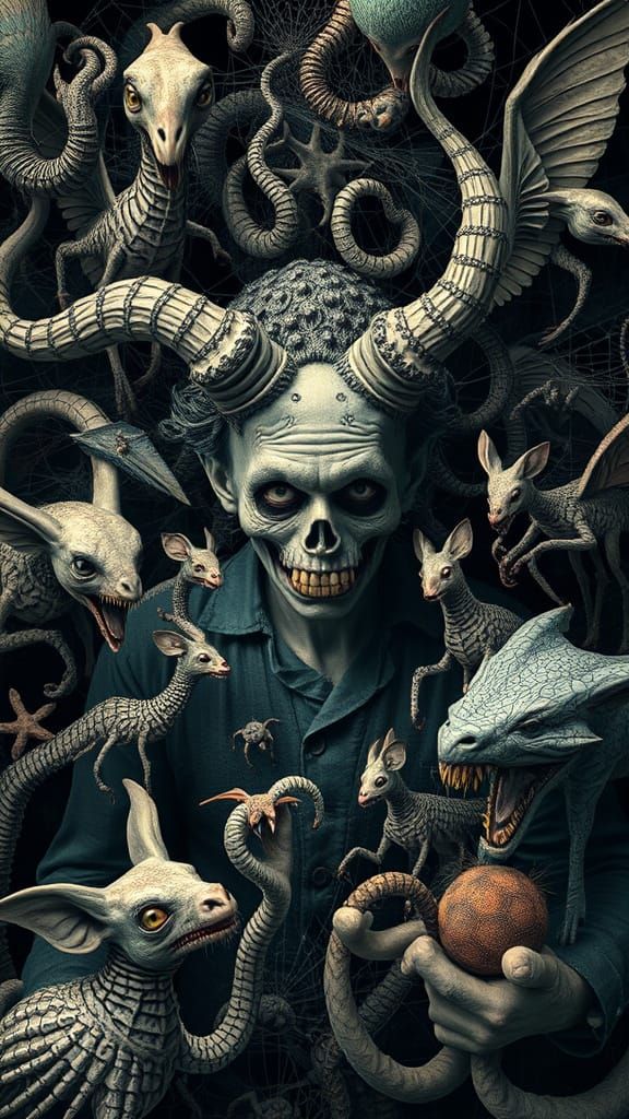 This haunting image features a madman surrounded by twisted, schizophrenia-inspired fairytale animals in a dreamlike, double exposure scene with intricate web-like patterns and vivid, unsettling details, blending the eerie quality of Ash Thorp with the surreal elements of James Jean.