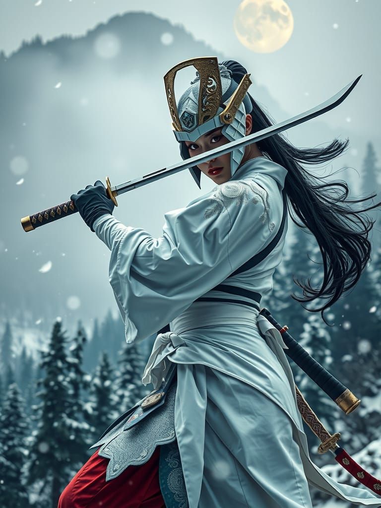 This image shows a strong Japanese warrior woman in white samurai clothing wielding a katana. The backdrop features a misty winter forest with falling snow, rendered with hyperrealistic detail and a cinematic atmosphere.