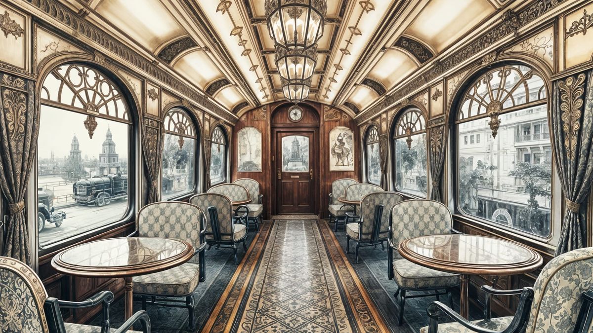 This image depicts a luxurious 1930s train interior with intricate Art Deco details, soft pastel colors, and a touch of surrealism, evoking a sense of nostalgia and elegance.