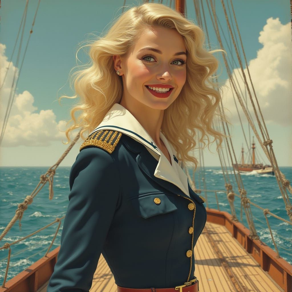 This image captures a confident European woman with blonde, wavy hair, wearing a crisp sailor uniform, walking on the deck of a vintage warship. Influenced by the Art Deco style and photorealistic details, the image is a vibrant and elegant representation of a bygone era.