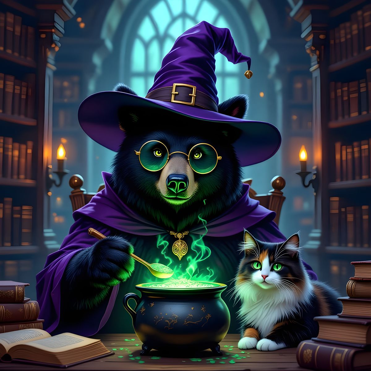 A mystical scene of a black bear casting spells in a grand library, surrounded by ancient tomes, magical artifacts, and a curious cat. This enchanting artwork combines warm colors, intricate details, and fantastical elements, evoking a sense of cozy wonder.