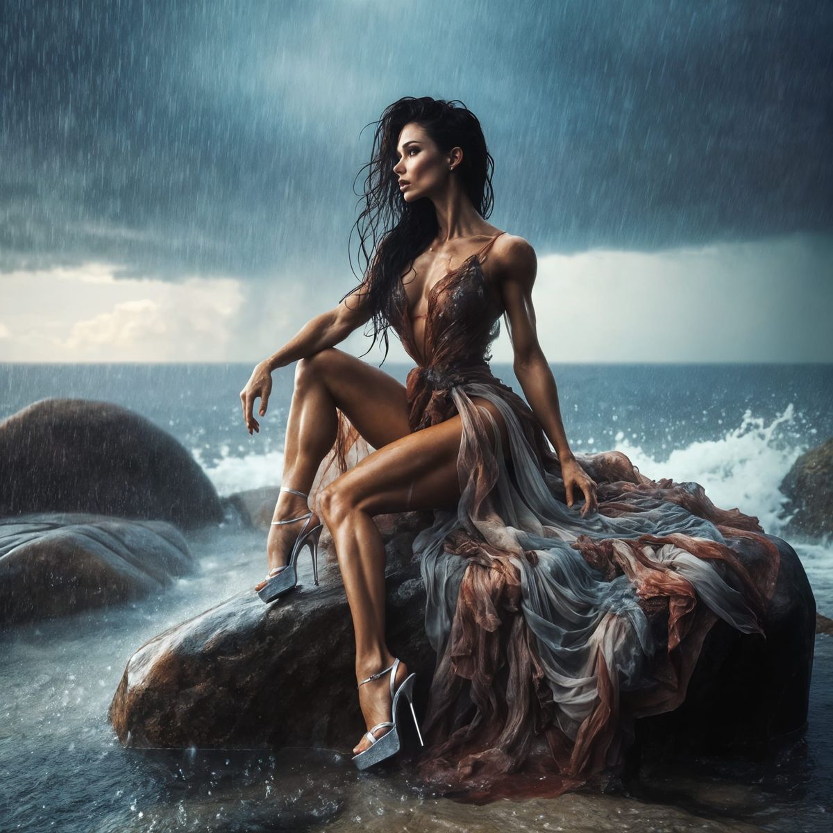 A full-body view of a strong, 25-year-old Czech fitness instructor in a sheer dress, sitting on a rock by the coast during a rainstorm. Rendered in a cinematic, concept art style with deep colors.