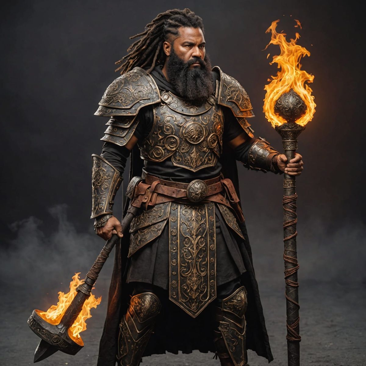 This image shows a powerful, middle-aged warrior in glowing armor. The warrior has dark brown dreadlocks and a stern expression. The image depicts a legendary character as a portrait.
