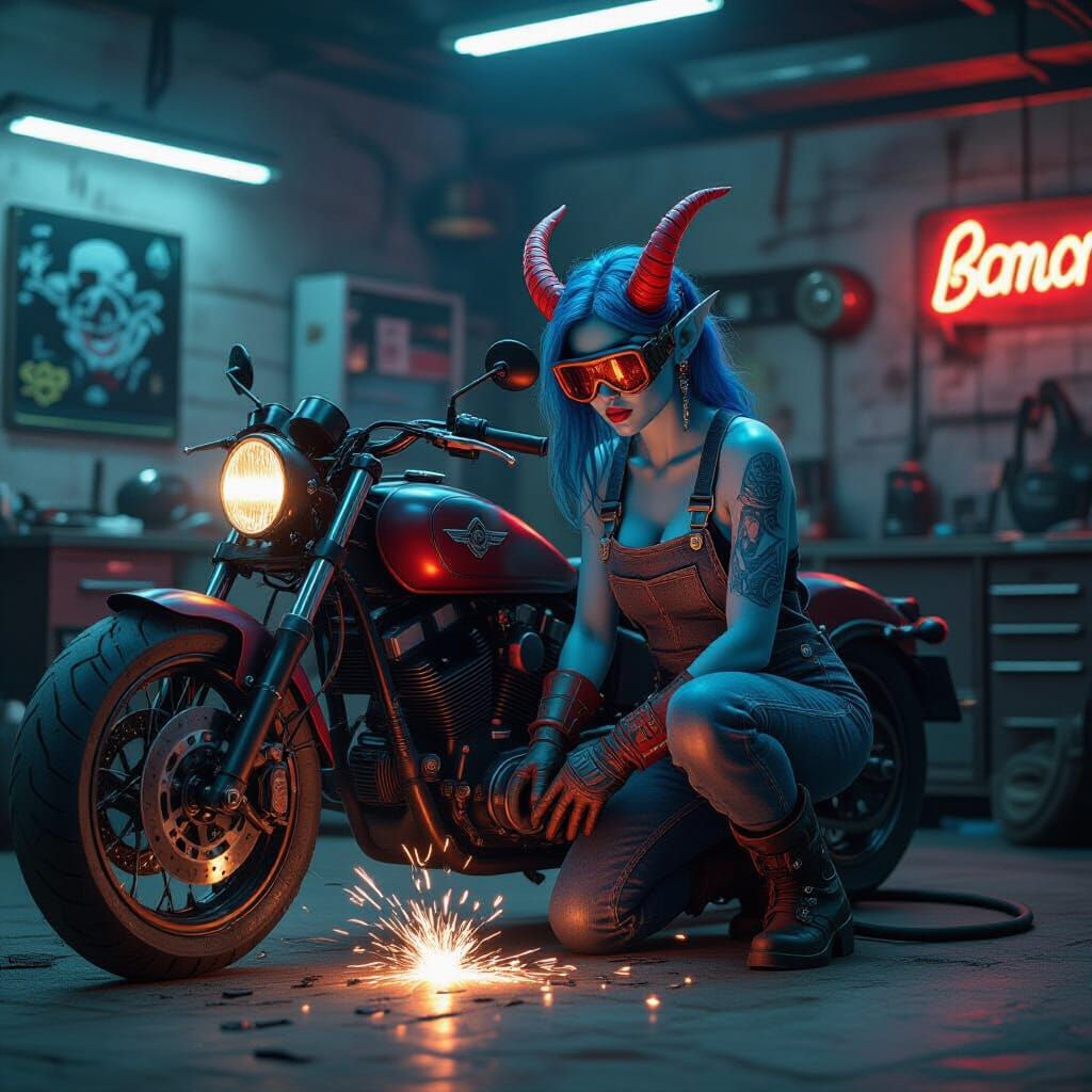 A tiefling mechanic is shown working on a cyberpunk motorcycle in a neon garage. The artwork has a hot rod aesthetic with cinematic lighting and an epic atmosphere in art deco style.