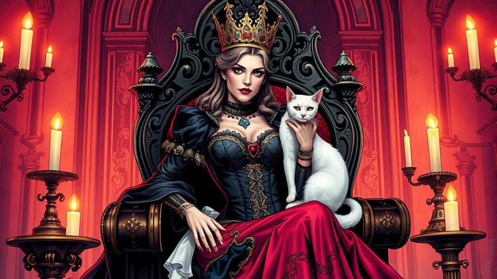A regal gothic queen sits on a throne holding a white cat. The image features dramatic shadows and vibrant colors in a comic book art style, rendered with smooth lines and perfect textures.