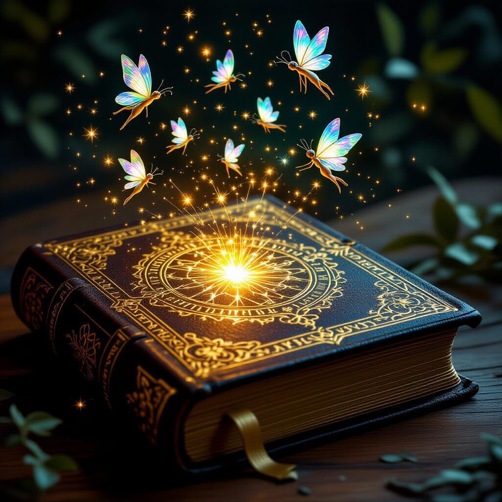A captivating image shows a magical book unleashing golden light and tiny fairies. The scene is rendered with ultra-detailed fantasy photography, evoking a dreamy and ethereal ambiance.