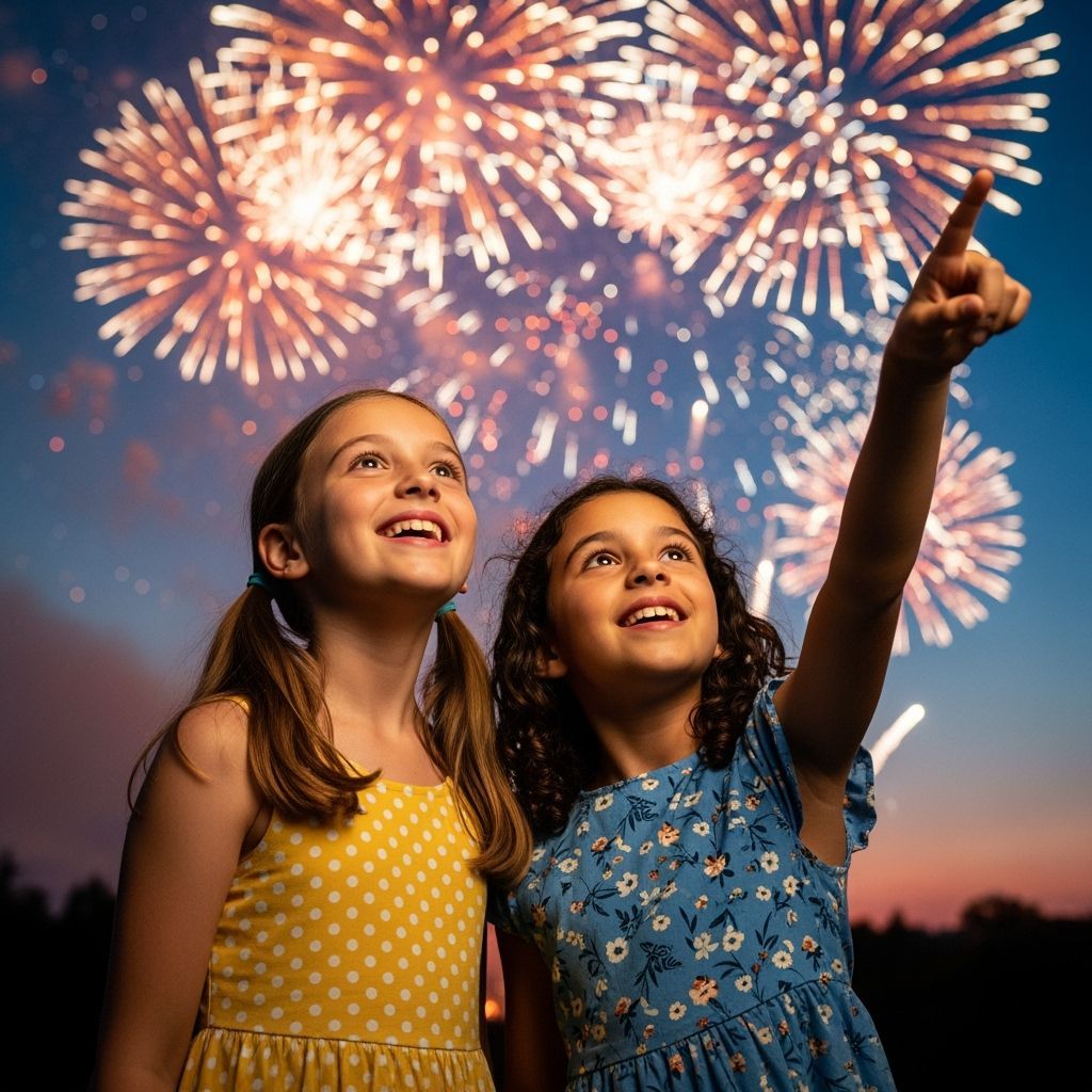A photograph shows two young girls in summer dresses, joyfully watching fireworks. The image captures a hyperrealistic scene with vibrant colors and intricate details, reminiscent of cinematic photography.