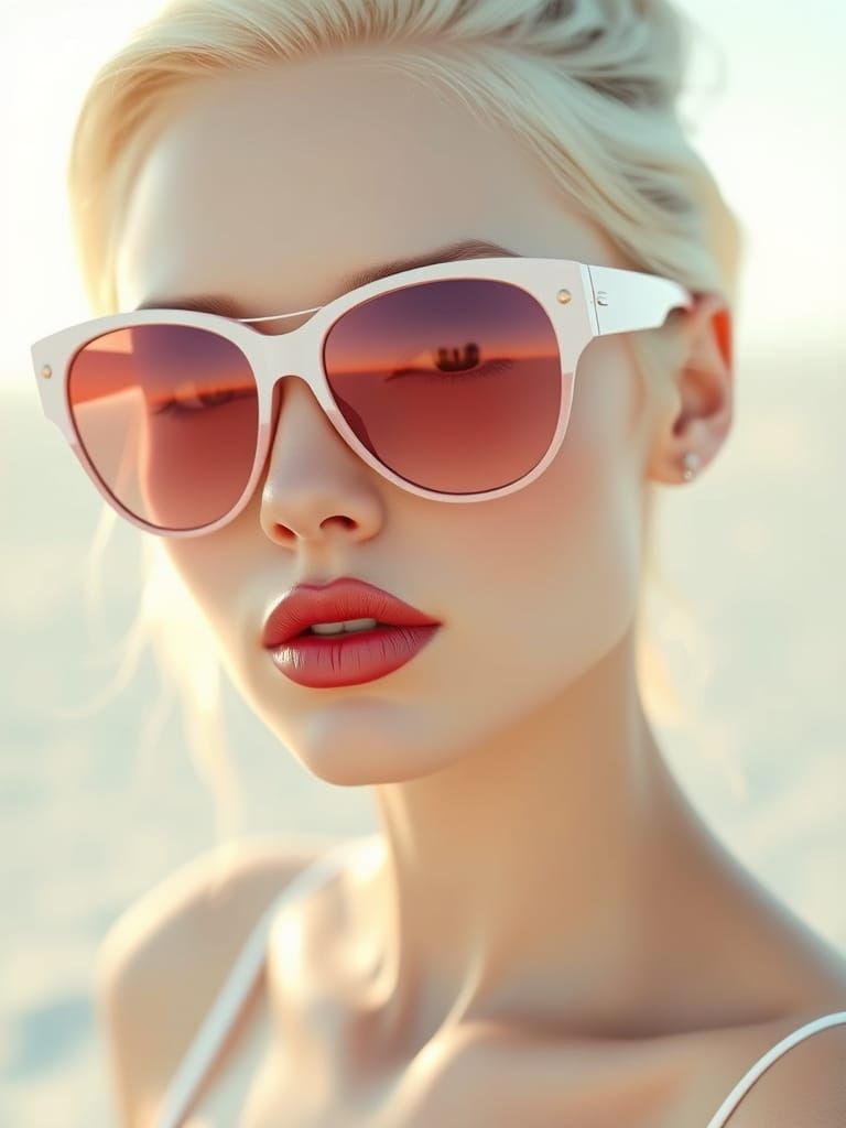 This image shows a close-up fashion portrait of a woman with striking features, contrasted against a blurred beach background. The portrait features hyperdetailed rendering and dynamic lighting, reminiscent of trending digital art.