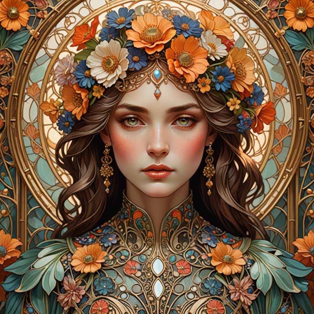 This image features a close-up portrait of a woman in an ornate, Art Nouveau-inspired dress covered in shimmering mirrors and colorful flowers. Soft focus and warm, golden lighting create a luxurious atmosphere, while delicate patterns and textures add to the elegance.