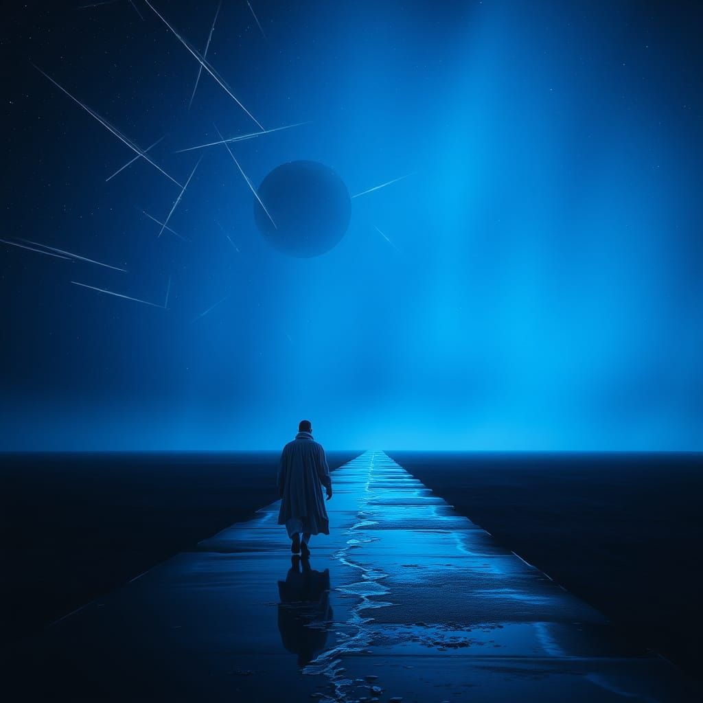A lone figure walks a crystal road under a dark, fractured sky. This image evokes a surreal, digital art style, blending elements of cosmic loneliness and cinematic lighting.