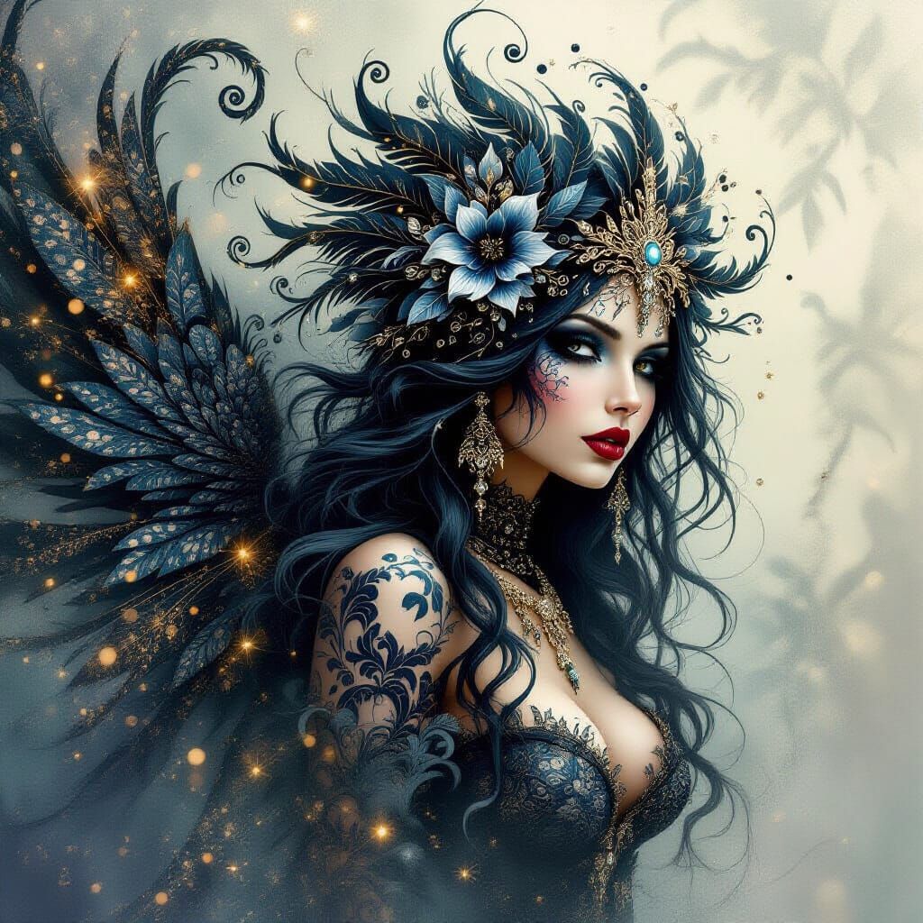 fantastically beautiful gothic museum collection of tropical shaggy sinister harpy, swirl of sparks, fantasy art, ultra detail, hyperrealism, glitter and shimmer, paisley, floral print, fine details, bokeh and shimmering dust, fog, dark world, paint splatter, blue/beige
