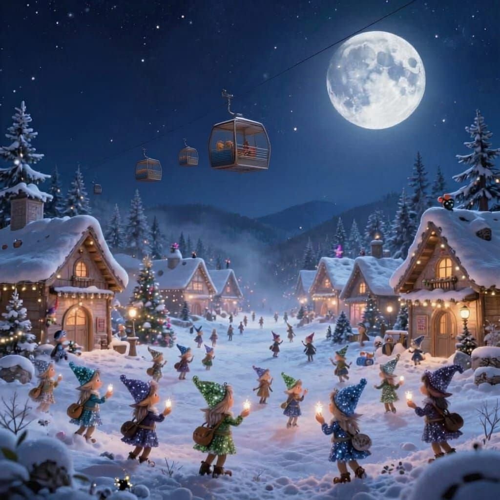 A hyperrealistic, Ghibli-inspired image of a busy Christmas goblin village in a snowy valley. Elves and fairies flutter under a colorful moon, creating a magical, ethereal fantasy scene with detailed mist.