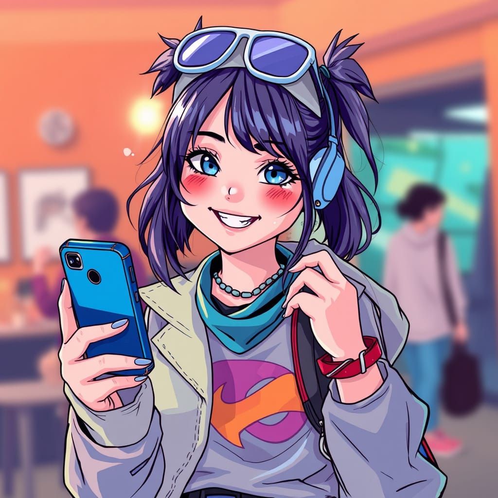 A vibrant image of a young girl with trendy accessories posting on Instagram. The colorful style features bold lines and dynamic textures, creating a lively and engaging scene.
