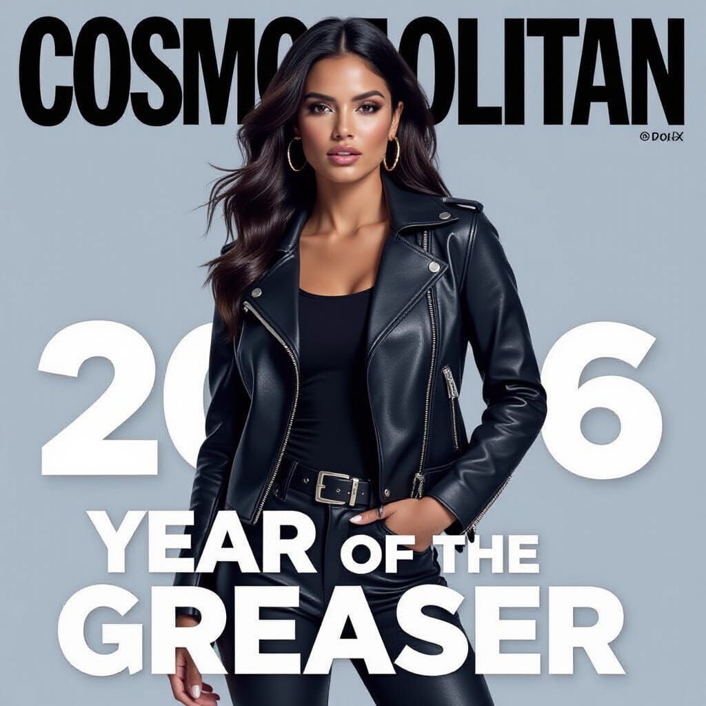 A striking Hispanic woman dressed in a stylish leather jacket, black spandex pants, and a black top on the cover of Cosmopolitan. The text on the magazine says, '2026, Year of the Greaser'