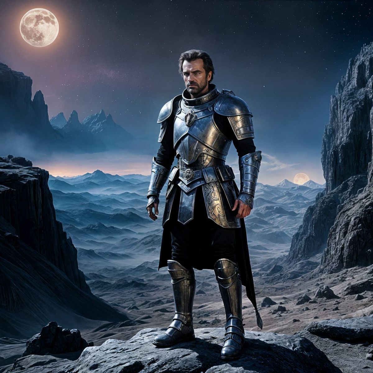 This image features a portrait of a youthful figure in dark armor against a lunar backdrop. The digital painting is detailed and cinematic, with dramatic and atmospheric qualities.