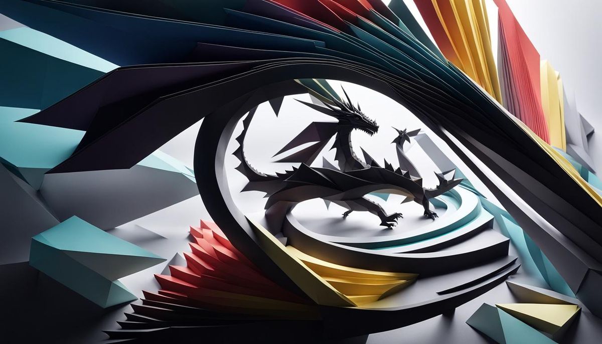 This image shows a geometric dragon constructed from solid geometric shapes. This colorful, detailed image uses origami and paper folding illustration techniques in a Bauhaus style.