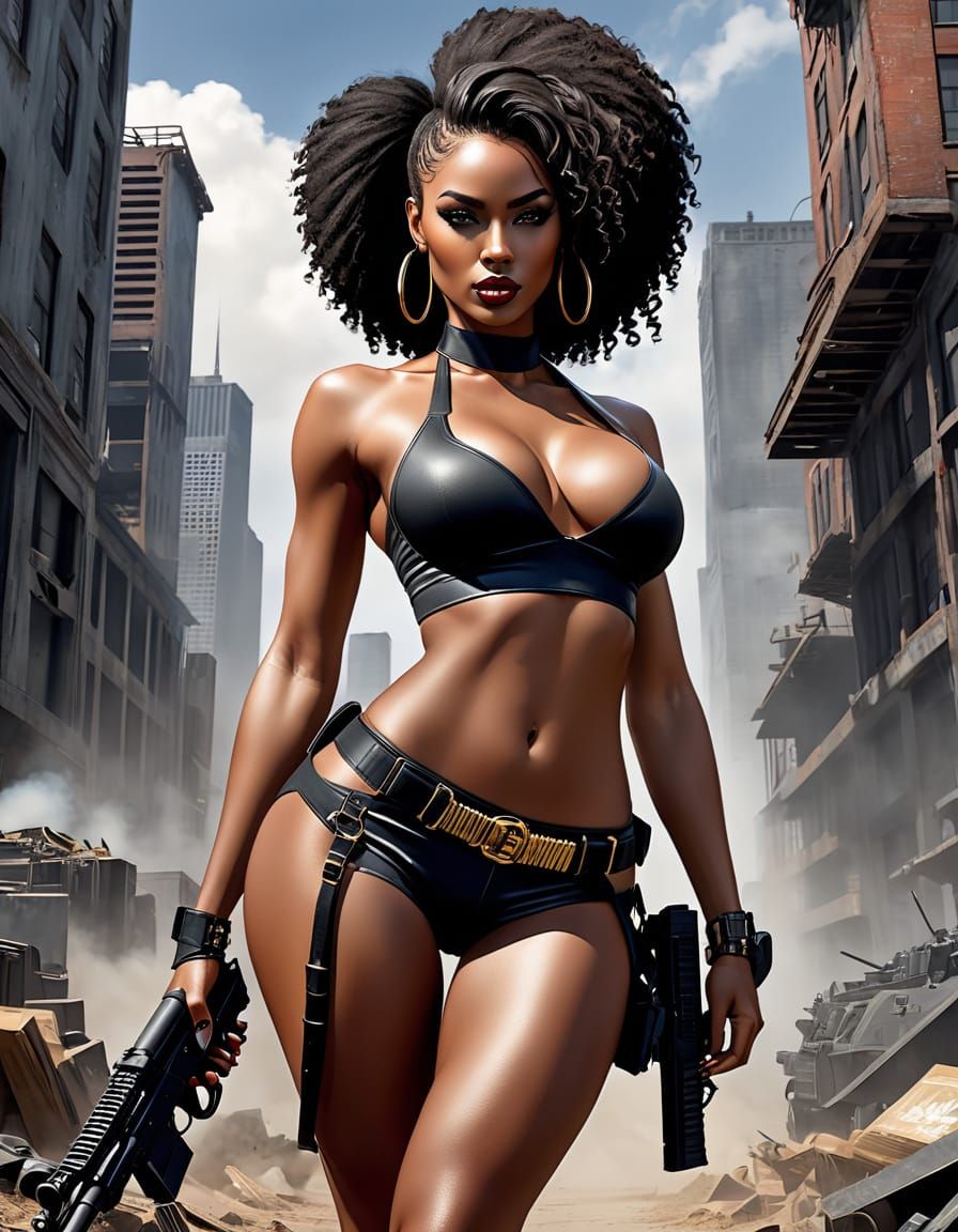 This image depicts a dynamic comic book cover featuring a beautiful African American woman in a powerful action pose, holding a machine gun. Rendered with extreme detail and lifelike realism.