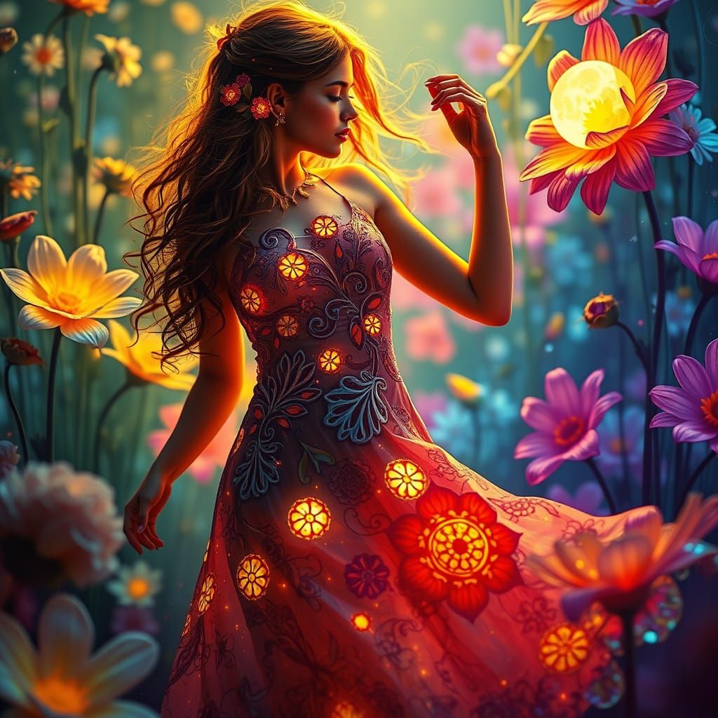 This image captures a mystical scene of a woman dancing amidst vibrant flowers that blend sun and moon elements. The dreamlike atmosphere is characterized by bold colors, soft light, and delicate patterns.