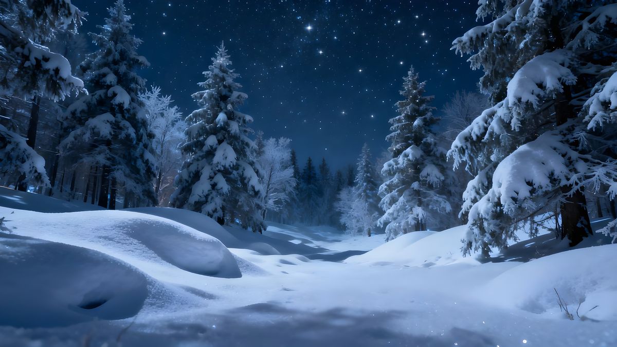 A picturesque and realistic scene of a magical forest at night, with snow-covered fir trees standing in silent drifts under a starry sky.