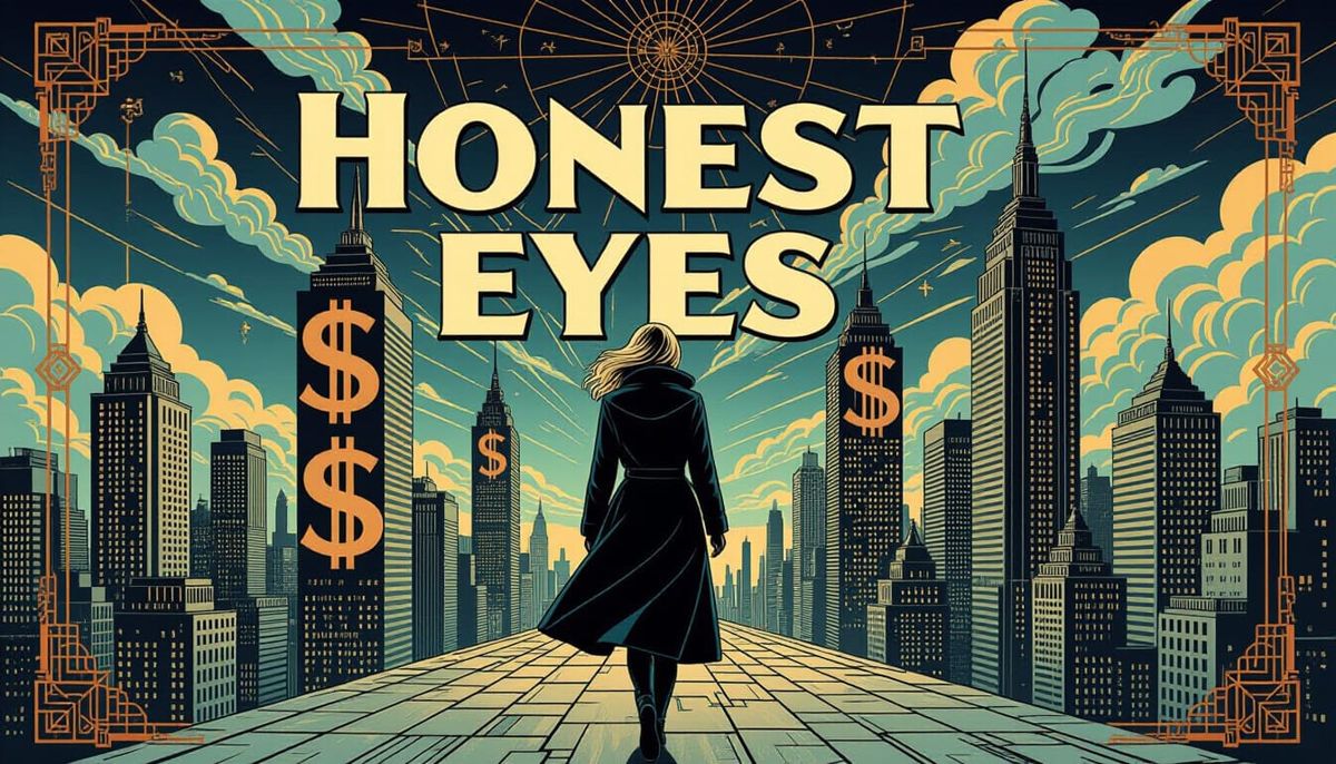 A digital illustration of a woman walking away from dollar sign skyscrapers. The image blends art deco Victorian fonts with geometric patterns and muted tones to create a surreal, futuristic scene.