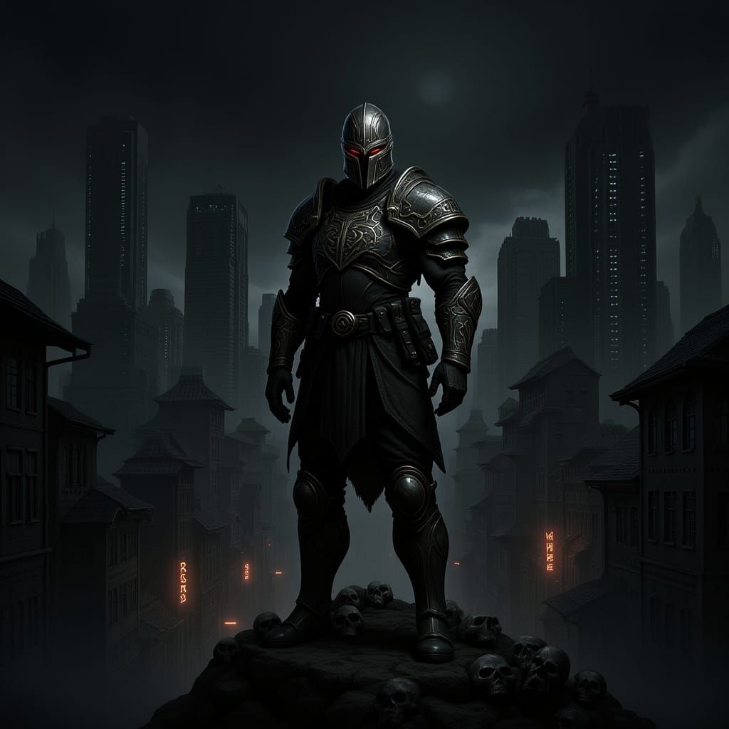A solitary warrior surveys a vast cyberpunk metropolis from a mountain of skulls. The figure wears glyph-covered armor in this dark fantasy concept, rendered with cinematic lighting and a gritty, post-apocalyptic style.