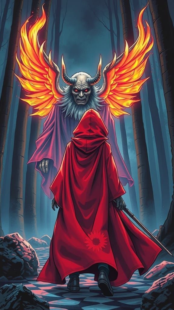 This image shows Red Riding Hood in a futuristic cloak encountering an old warlock with fiery wings in a neon forest. The artwork blends cyberpunk and traditional Japanese art styles.