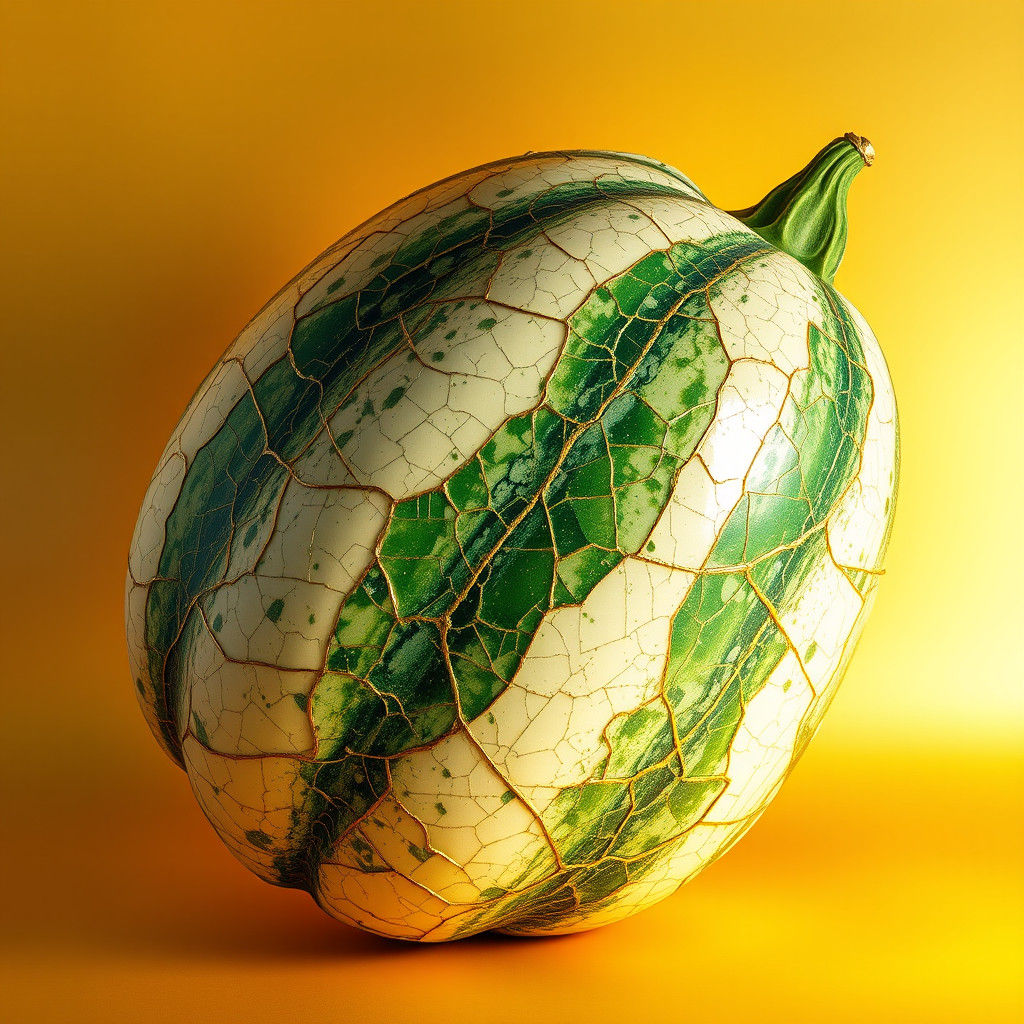 A striking picture of a massive cucumber adorned with golden kintsugi repairs. Fractured geometric forms give the cucumber a cubist aesthetic against a warm golden background, in elegant surrealism.