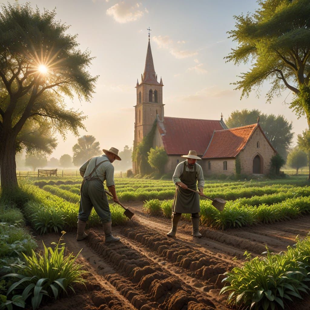 An oil painting capturing a farmer tending rich soil near a rustic church. Features early morning light, intricate brushstrokes, and detailed textures in a serene landscape.