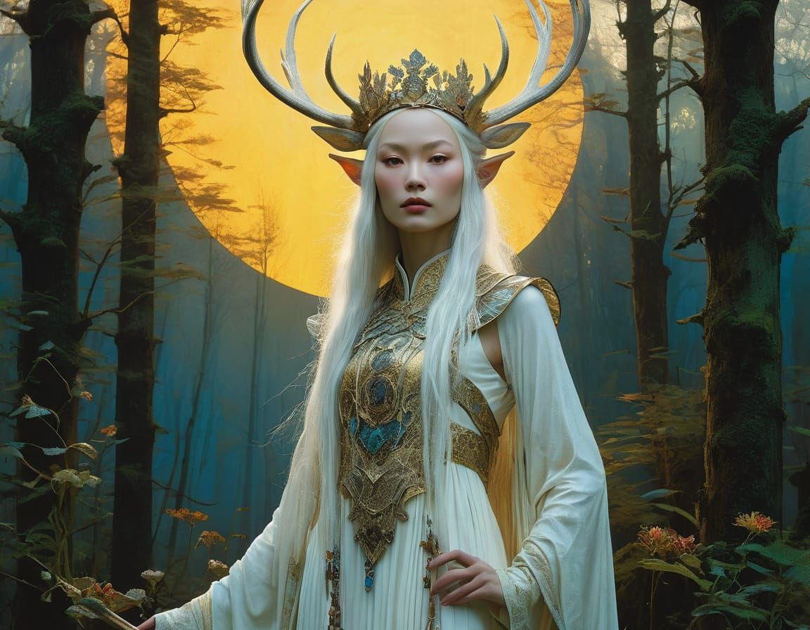 A stunning image of an otherworldly elven princess with delicate features and a majestic crown, set amidst a richly colored sunset in a forest glade, with intricate details and a dynamic pose reminiscent of classic fantasy art.